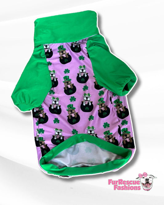 Pittie Pot O' Gold Pink - Dog Pajama with Green Neck & Trim/Sleeves