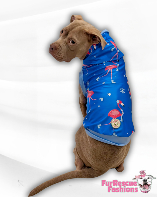 Winter Flamingos Dog Pajama with Light Blue Neck & Trim/Sleeves