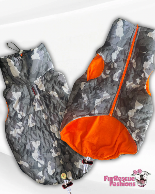 Winter Camo Weather Resistant Puffer Vest - Closure on the Front OR Back