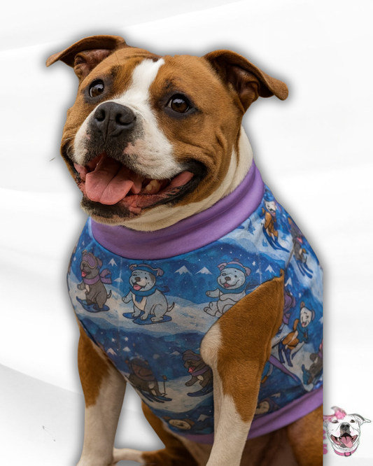 Winter Slope Buddies Dog Pajama with Lavender Neck & Trim/Sleeves