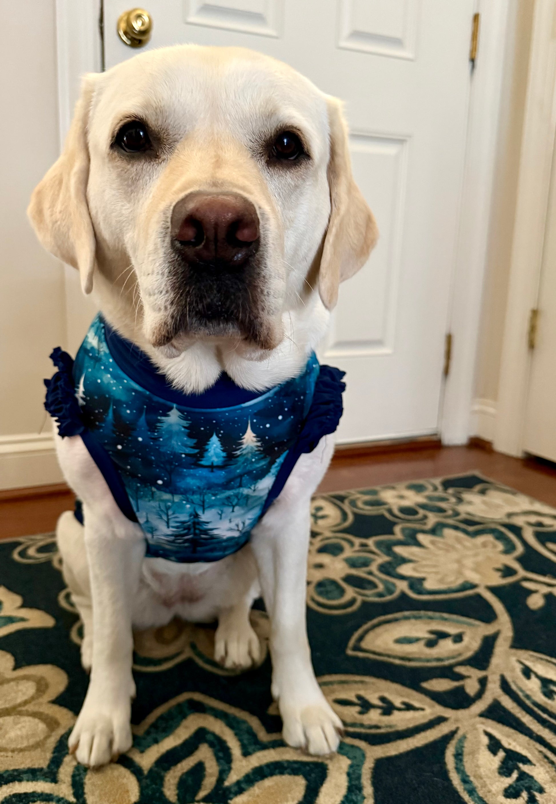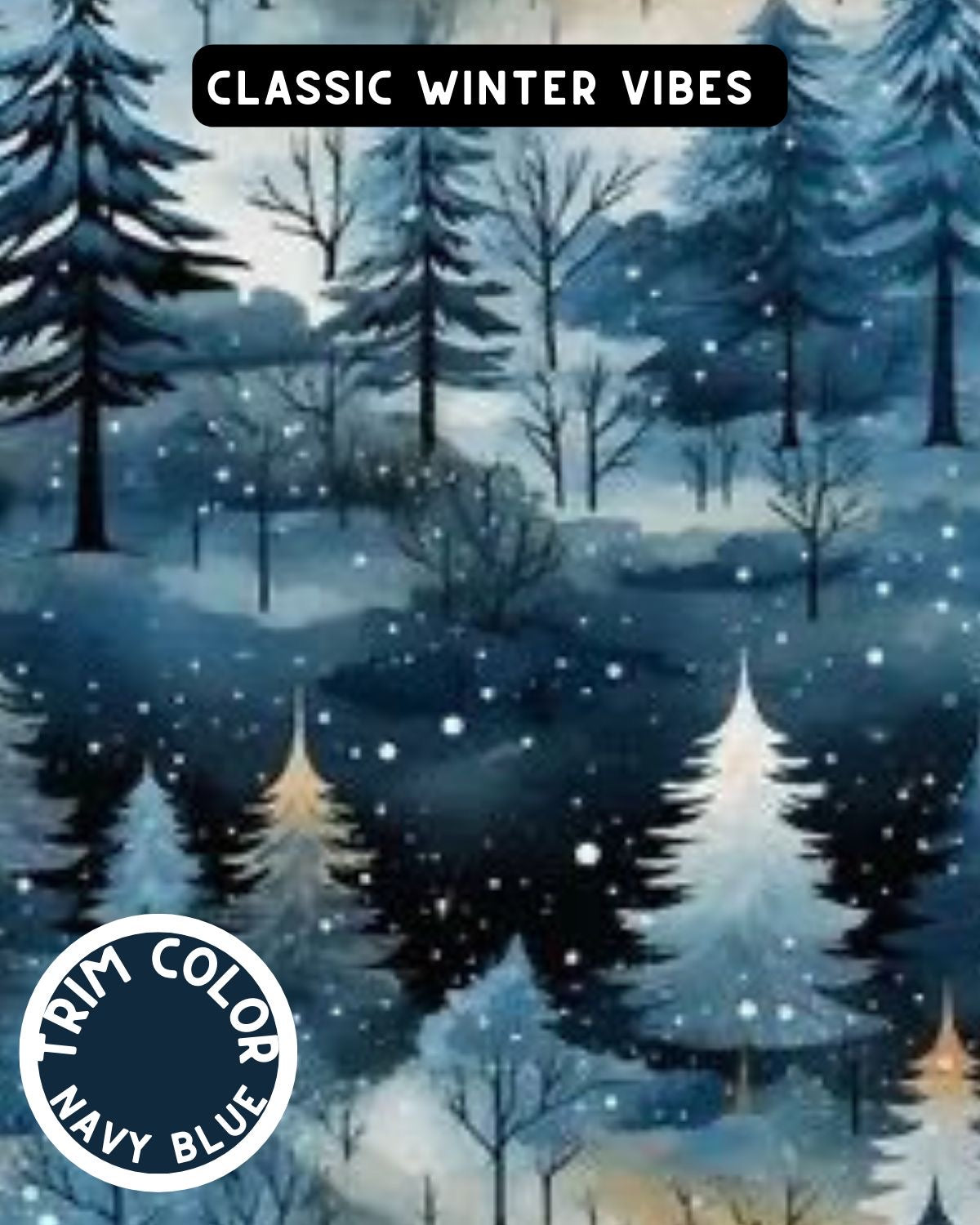 Wrap your pup in timeless charm with this serene snowy forest & pines print. Shades of navy and icy blue capture the peaceful magic of winter nights — elegant, cozy, and perfect for holiday strolls. Trimmed in classic navy for the ultimate winter chic look!