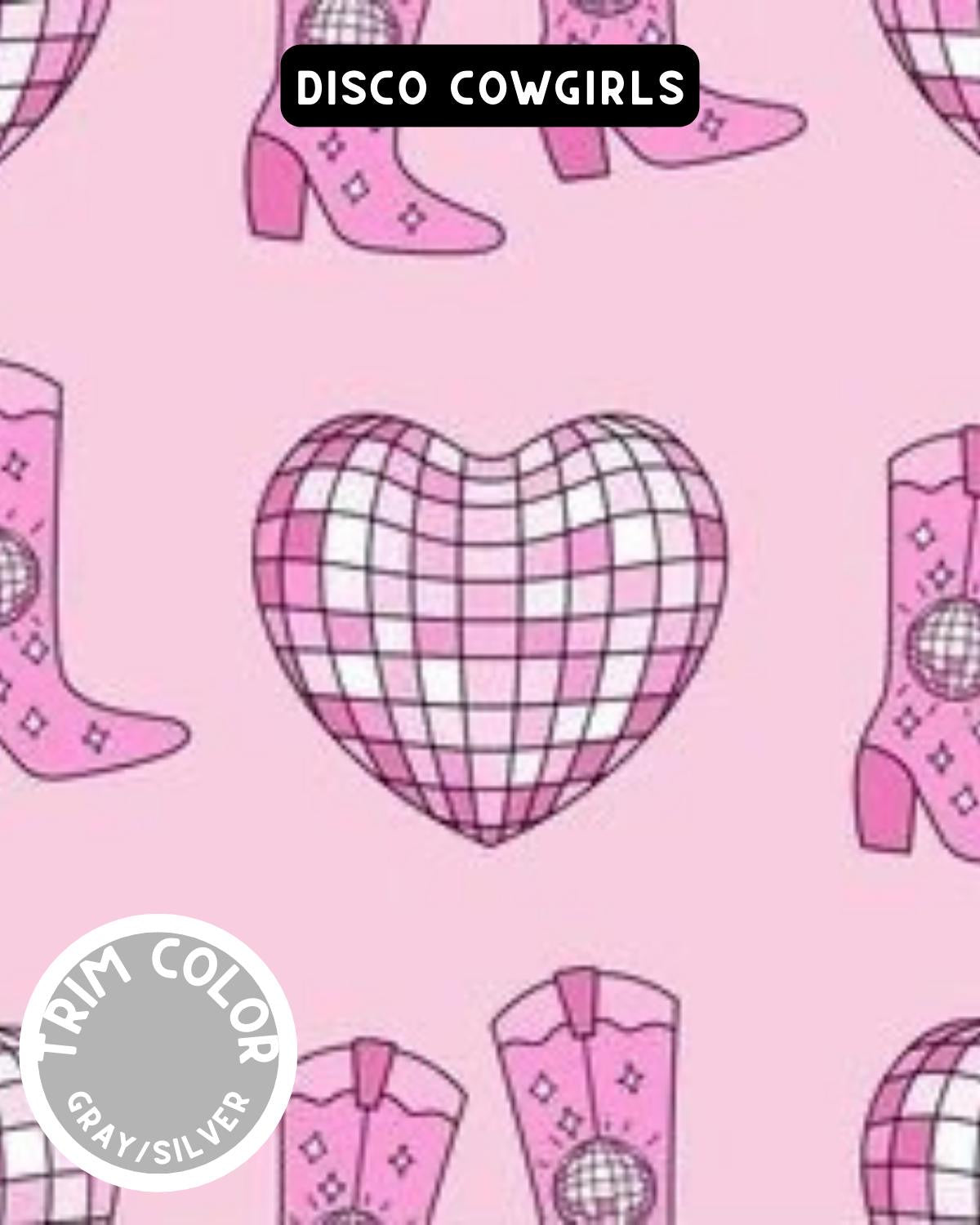 Disco Cowgirls mixes western flair with retro glam—sparkly disco hearts and pink cowgirl boots on a soft blush background.