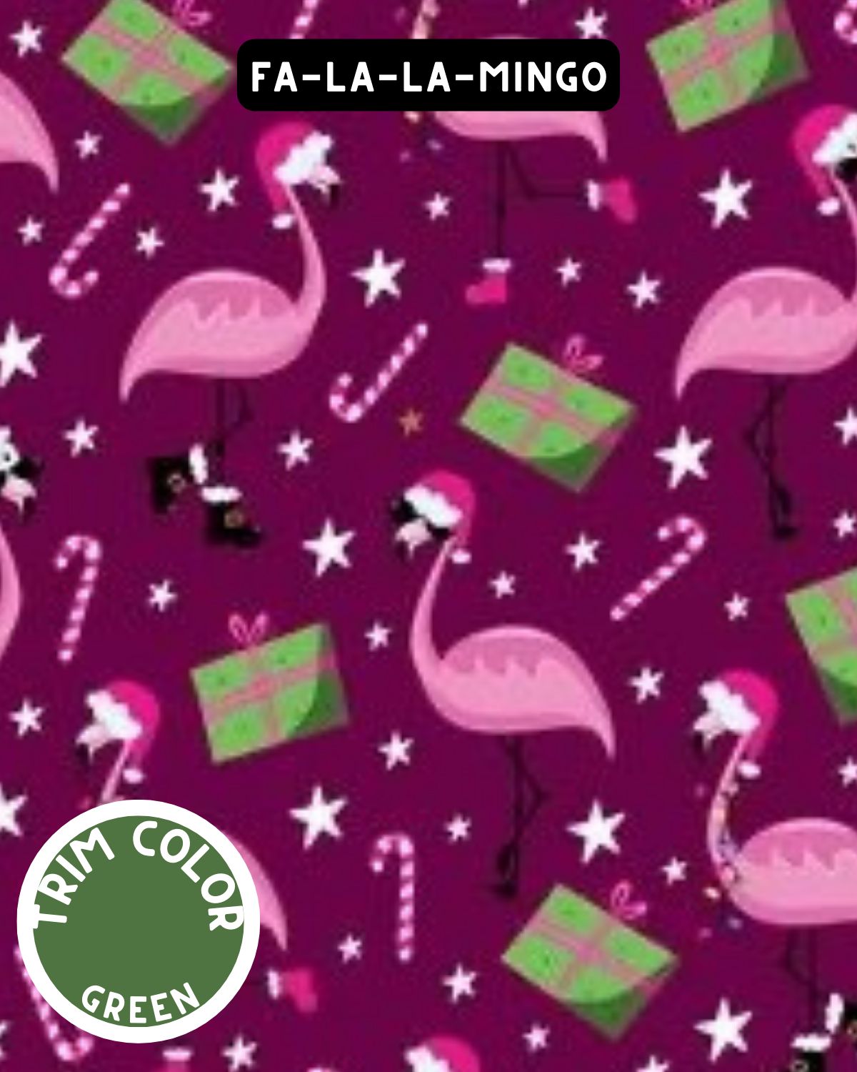 Bring some tropical cheer to the holidays with our Fa-La-La-Mingo outfit! This playful design features pink flamingos decked out in Santa hats, surrounded by candy canes, stars, and presents on a rich holiday background. Paired with a festive green trim, it’s the perfect mix of merry and beachy vibes.