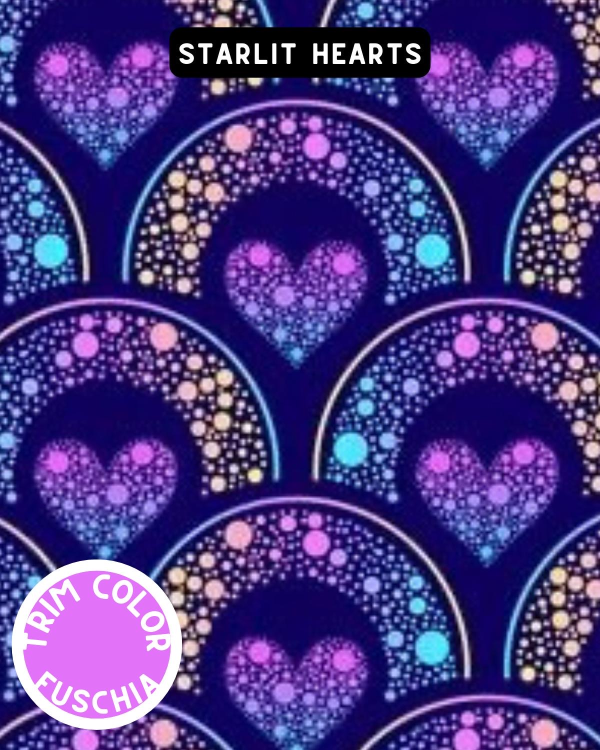 Starlit Hearts glows with dreamy, constellation-style hearts and sparkling arches set against a deep night-sky blue, finished with a bold fuchsia trim.