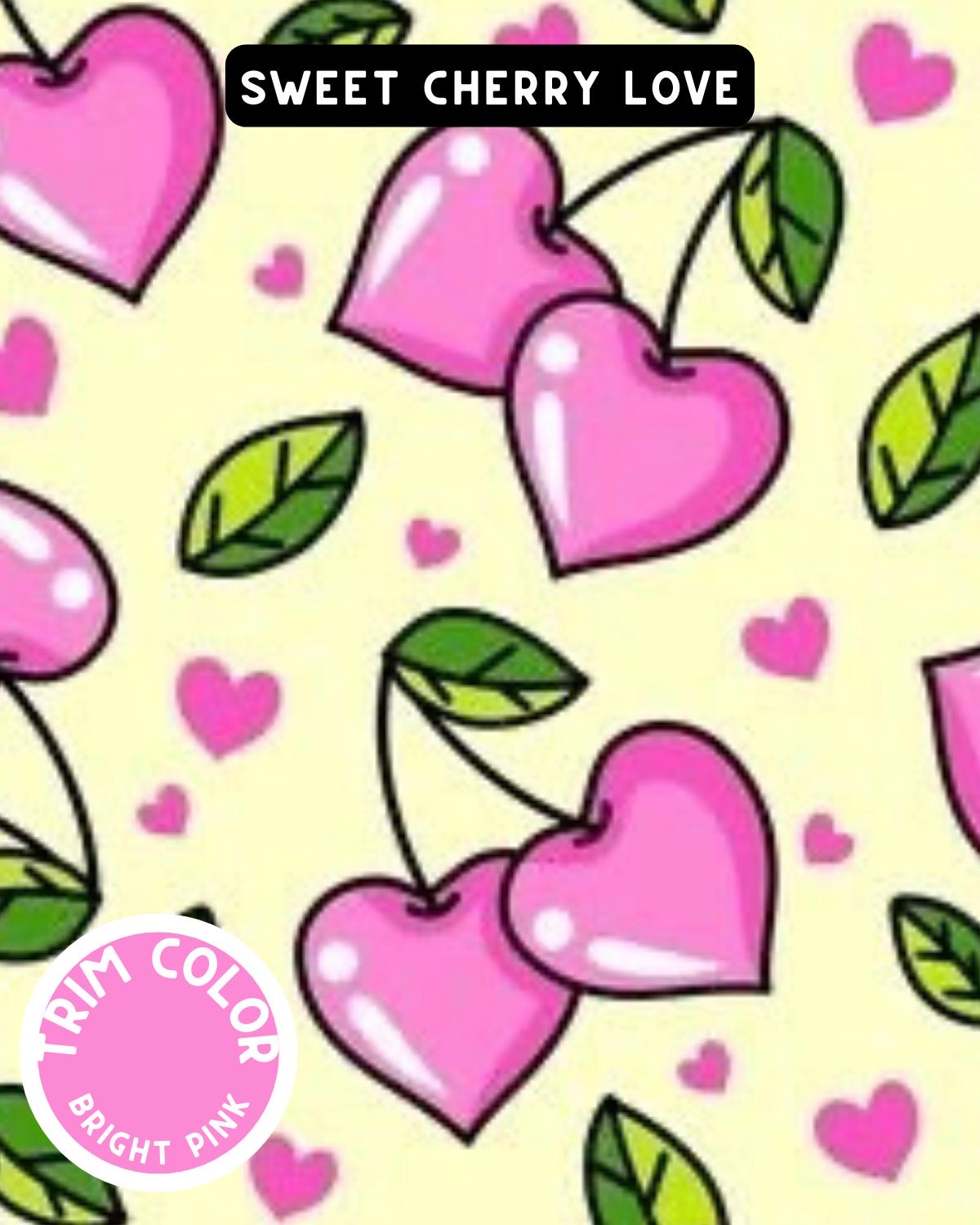 Pink heart-shaped cherries and tiny love accents come together in this cheerful, love-filled pattern made to steal hearts.
